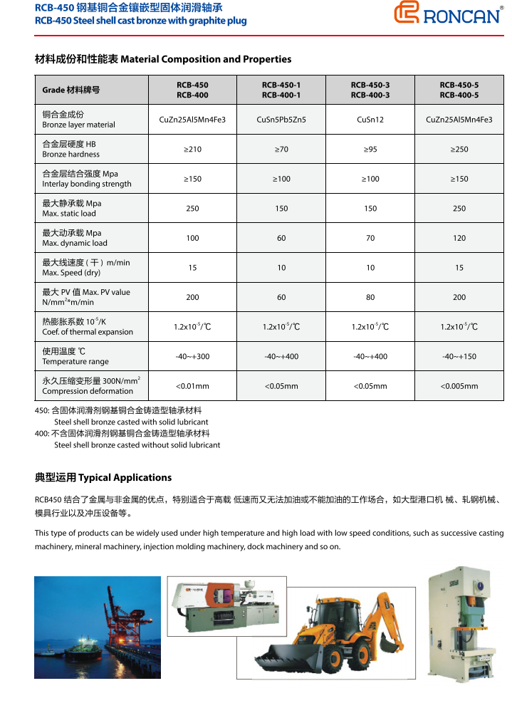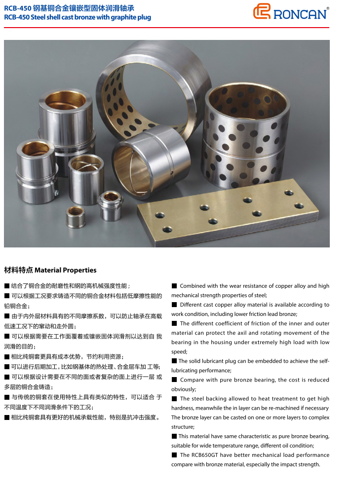 RCB450結(jié)合了金屬與非金屬的優(yōu)點,特別適合于高載低速而又無法加油或不能加油的工作場合,如大型港口機械、軋鋼機械、模具行業(yè)以及沖壓設(shè)備等。